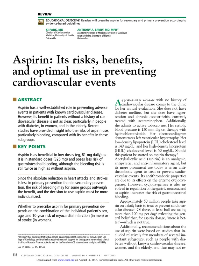 Aspirin Benefits Vs Risk PDF Aspirin Cardiovascular Diseases